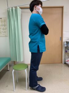 ①  浅く腰をおろせる位置で、足を肩幅くらいに広げ、両手は胸の前でクロスさせ立つ